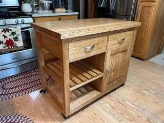Kitchen Island- Made using red oak, this mobile baking station is a solid addition to any kitchen. Features soft close hinges and drawer slides, an adjustable shelf, towel rack, and locking casters.