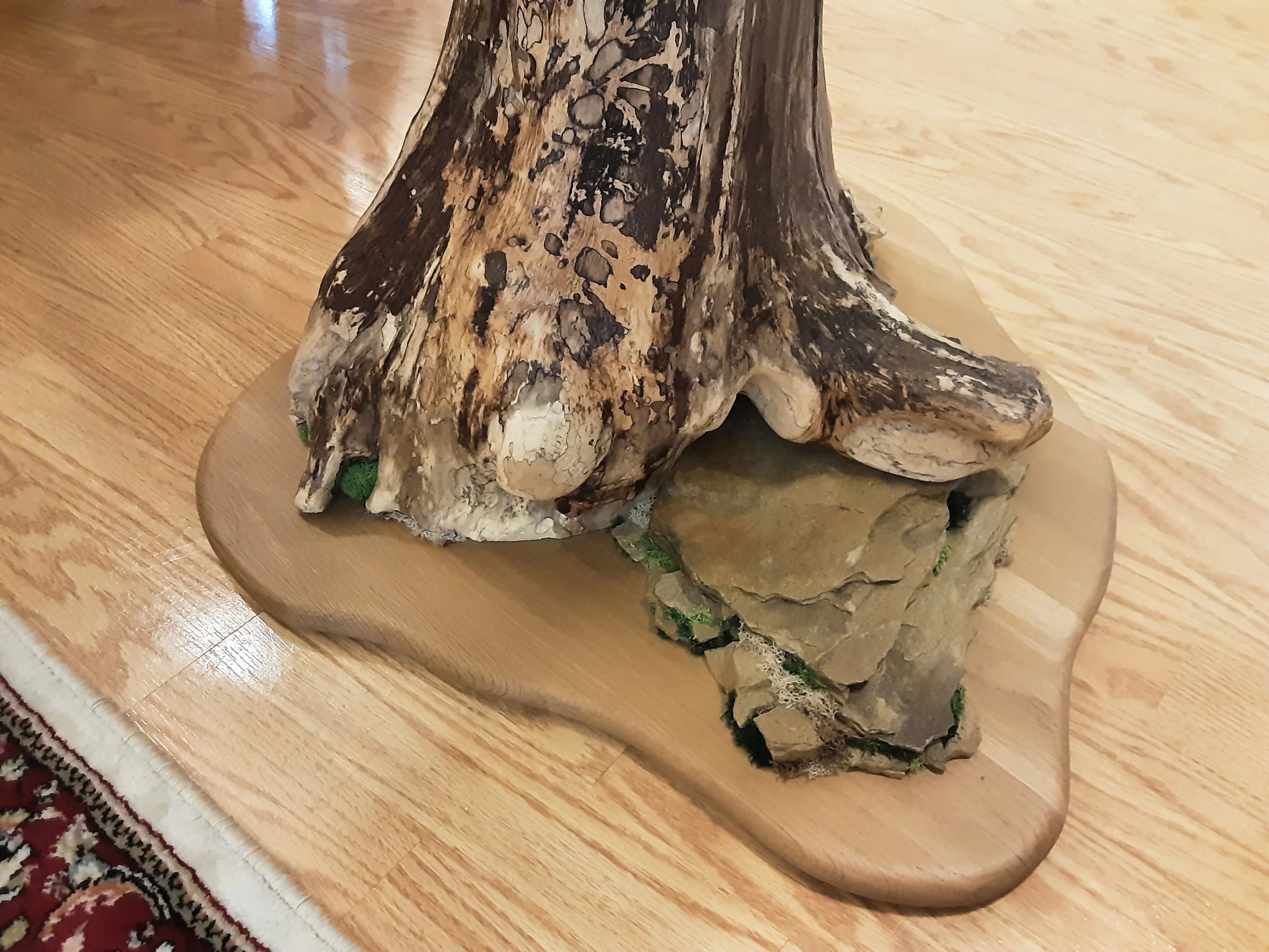 Rustic Walnut Table- Bring the rugged beauty of nature indoors. A classic round walnut top paired with a genuine tree trunk and root style base, with the roots artistically growing over rocks blanketed in soft, vibrant moss.